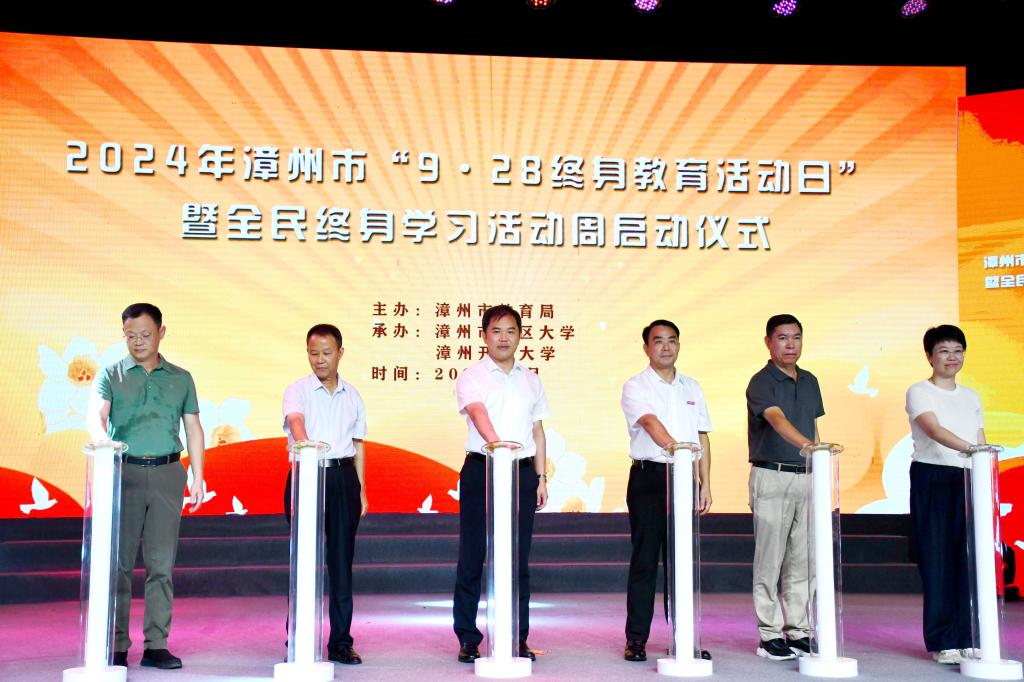 为学习贯彻习近平总书记关于教育的重要论述,认真落实建设全民终身学习的学习型社会、学习型大国的要求,9月27日,以“让学习成为一种生活方式”为主题的2024年漳州市“9·28终身教育活动日”暨全民终身学习活动周启动仪式在漳州开放大学举行,活动采用线下活动与线上直播相结合的方式进行。启动仪式由漳州市教育局主办,漳州市社区大学、漳州开放大学承办。漳州市委教育工委书记、市教育局局长卢炳全,漳州开放大学党委书记、校长詹志灵,漳州市委宣传部三级调研员张清芳,漳州市文旅局、漳州市民政局、漳州市总工会相关分管领导以及漳州市老年大学,相关高等院校、中职学校领导出席;“百姓学习之星”“终身学习品牌”“漳州市社区大学优秀教师”获奖代表、各县(区)社区大学领导、漳州开放大学、漳州市老年开放(互联网)大学师生代表以及新闻媒体代表共计200余人参加。漳州市教育局副局长郑彦主持启动仪式。