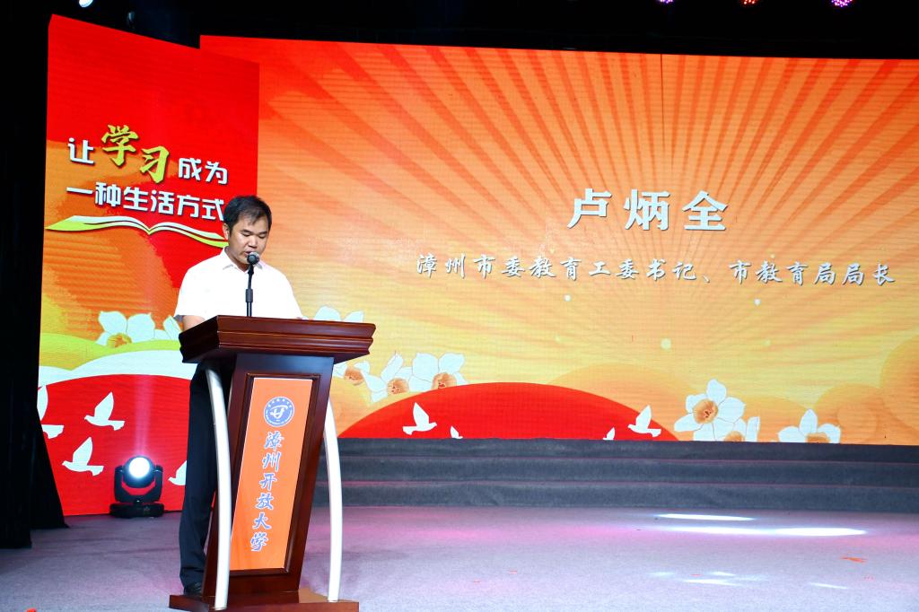 漳州市委教育工委书记、市教育局局长卢炳全致辞。他指出,党的二十届三中全会提出的“推进教育数字化,赋能学习型社会建设,加强终身教育保障”部署要求,是在建设教育强国历史新征程背景下的又一个新起点。漳州市历来重视终身教育体系建设,积极发挥教育、宣传、文化和旅游、工会、老龄工作系统资源优势,依托漳州市社区大学、漳州开放大学、漳州城市职业学院等学校,不断丰富活动内容,突出地方特色,激发全民参与,助力“人人皆学、处处能学、时时可学”的学习型社会、学习型大国建设。他强调,让学习成为一种生活方式是完善全民终身学习教育体系的生动实践,社会各方都应积极参与,开展沉浸式、立体化终身教育实践体系,构建开放共享的终身学习公共服务平台。