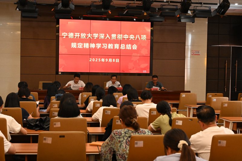 9月8日,宁德开放大学召开深入贯彻中央八项规定精神学习教育总结会,传达学习习近平总书记关于深入贯彻中央八项规定精神学习教育的重要指示精神、中央党的建设工作领导小组会议精神,总结宁德开放大学学习教育情况,部署巩固拓展学习教育成果、锲而不舍落实中央八项规定精神、推进作风建设常态化长效化工作。宁德开放大学党委书记、校长叶祖庚出席会议并讲话,宁德开放大学党委成员、副校长王晓飚出席会议并传达上级会议精神,全体党员教师参加会议。党委副书记、纪委书记余水淮主持会议。