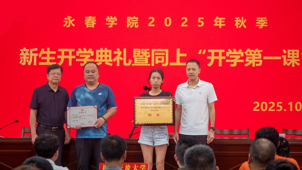 开学典礼上,陈涌湖、李锦江依次为福建省大学生创新大赛(2025)职教赛道高职创业组银奖获得者洪炜盛团队,福建开放大学首届学生风采短视频征集活动二等奖获得者林志军,2025年福建省新时代“百姓学习之星”获得者林德华、郑志斌,福建开放大学2024年全省办学体系师生书画摄影作品评选活动三等奖获得者林小明、入展者涂燕珠,以及福建开放大学书法学本科首次毕业作品展入展者康贵土颁发奖牌或荣誉证书。