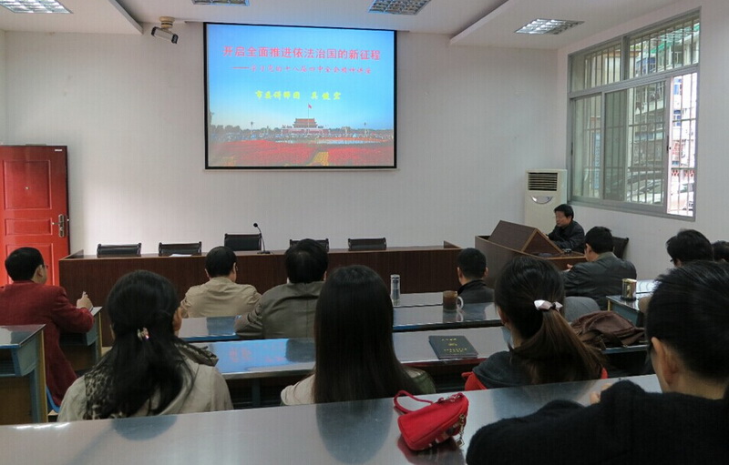 为深入学习宣传贯彻党的十八届四中全会精神,切实把全校教职工的思想和行动统一到十八届四中全会精神上来,12月1日,三明电大党总支组织中心组学习活动,邀请市委讲师团团长吴健宏作题为“开启全面推进依法治国的新征程”的专题讲座。全体教职工参加学习。