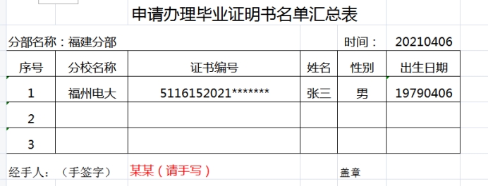 汇总表由经手人签字(须为手签字,不得打印),并加盖学籍主管部门公章。样表如下: