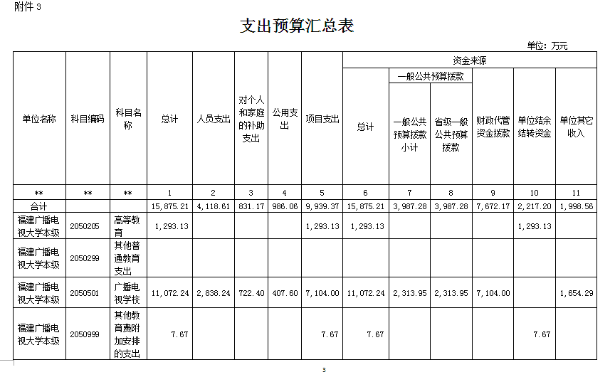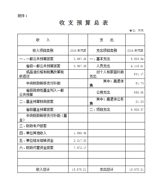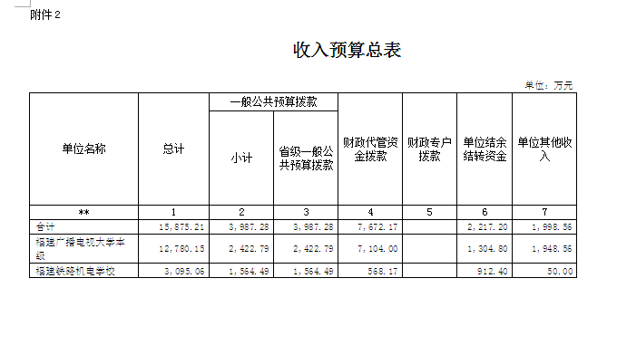 按照预算管理有关规定,目前福建广播电视大学预算的编制实行综合预算制度,全部收入和支出都反映在预算中。2016年福建广播电视大学收入预算为15,875.21万元,其中:一般公共预算拨款3987.28万元,基金预算财政拨款0万元,财政专户拨款0万元,财政代管资金拨款7672.17万元,单位其他收入1998.56万元,单位结余结转资金2217.2万元。相应安排支出预算15875.21万元,其中:人员支出4118.61万元,对个人和家庭补助支出831.17万元(不含退休人员基本退休费和生活补贴),公用支出986.06万元,项目支出9939.37万元。