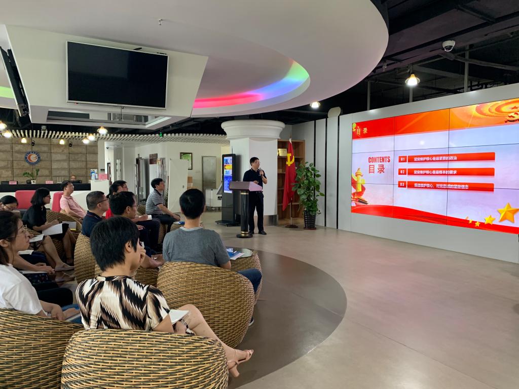 党支部书记李正光以“坚决维护核心,践行初心使命”为题给大家上了一堂生动的党课。李正光结合国际国内形势,从坚定维护核心是最紧要的政治、坚定维护核心是最根本的要求、锻造维护核心和对党忠诚的坚定信念三个方面作了阐述,要求党员将维护核心变成思想自觉、变成实际行动,讲规矩守纪律,激发工作热情和创造活力,立足本职工作,以马上就干的作风、敢于担当的精神,推动学校转型升级和内涵发展。支部委员吴永斌做了“坚决把“两个维护”落实到行动中”主题交流发言。随后,全体人员观看了《为了心底那份育人情怀》和《隐形26年终落网》专题视频。