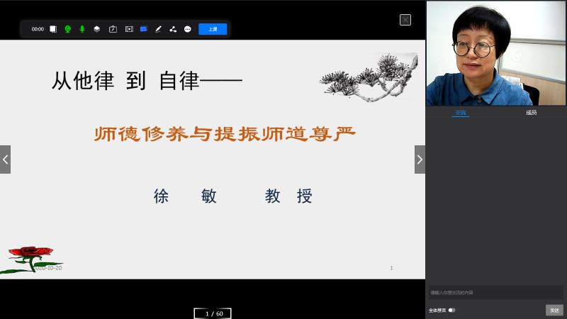 “师以载道,道之所存,师之所存;师以传道,传道授业解惑;师以行道,铁肩担道。”10月20日晚,国家开放大学网络教学核心团队成员、公共管理学院教授徐敏通过智慧教室平台为全省电大教师及教育类专业学生开展师德师风专题线上公开课《从他律到自律——师德修养与提振师道尊严》。