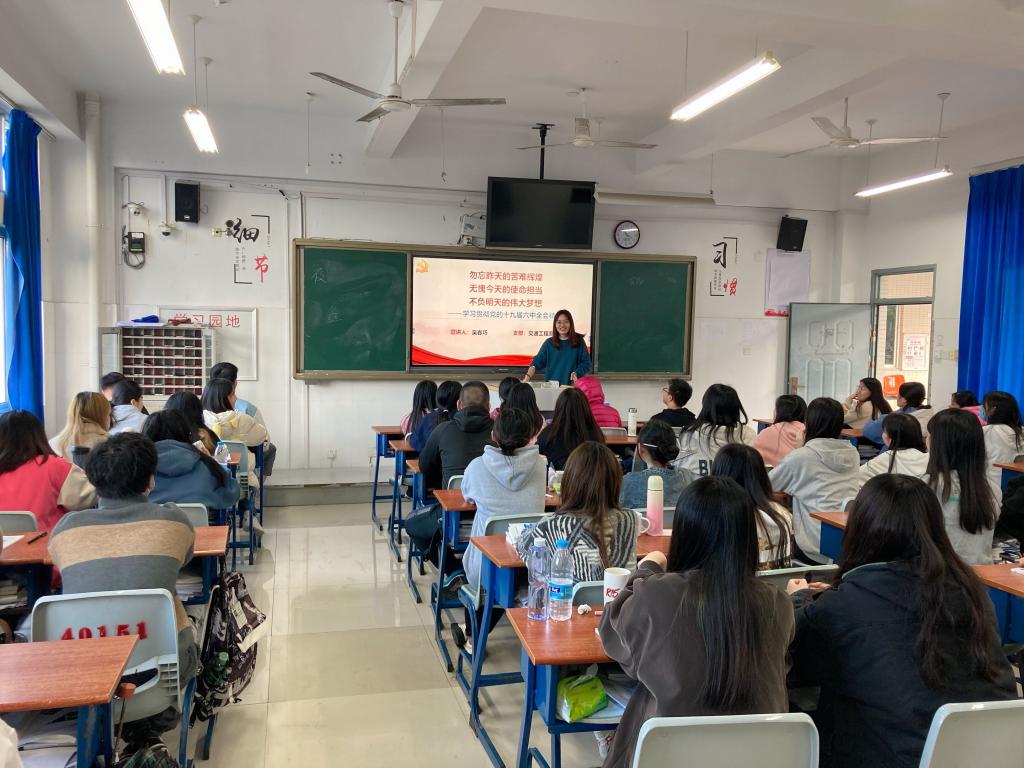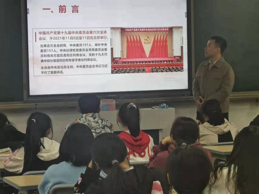 二位老师分别从全会的基本情况、党的百年奋斗重大成就、党的百年奋斗历史经验以及新的赶考之路四个方面对党的十九届六中全会精神进行了详细解读。同时,两位党员激励同学们要坚定信念、学深悟透六中全会精神,并做到内化于心,外化于行,努力学习,增长才干,成为一名德智体美劳全面发展的时代新人。