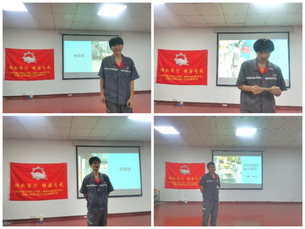 8月6日晚,机械系党支部带领20JD2班团支部在企业开展了首次阶段性交流汇报会,汇报会邀请了G16JD1班校友,现装配车间高级工兰佳文参与。同学们以小组为单位交流汇报了参与岗位实习一周以来的种种收获,共同分享着一周以来的辛勤与喜悦。装配2班团员学生杨凯琪说:“8月的泉州,酷暑当头,我们在车间参与实践,每一次操作都伴着一份收获,让我们进一步体会了什么是知行合一,汗水虽然浸湿了工帽,梦想却照进了未来。”