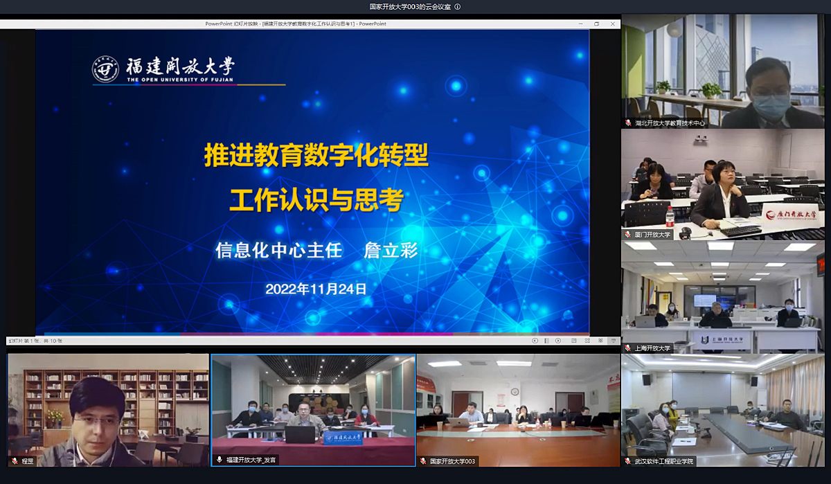 为深入学习贯彻党的二十大精神,协同推进开放教育数字化转型,11月24日,国家开放大学信息化部党支部、国开在线党支部联合我校信息化中心党支部,通过远程视频会议形式开展“学习贯彻党的二十大精神 携手推进数字化转型”联学联建主题党日活动。活动由国家开放大学信息化部党支部书记程罡主持,我校信息化中心党支部全体党员参加。