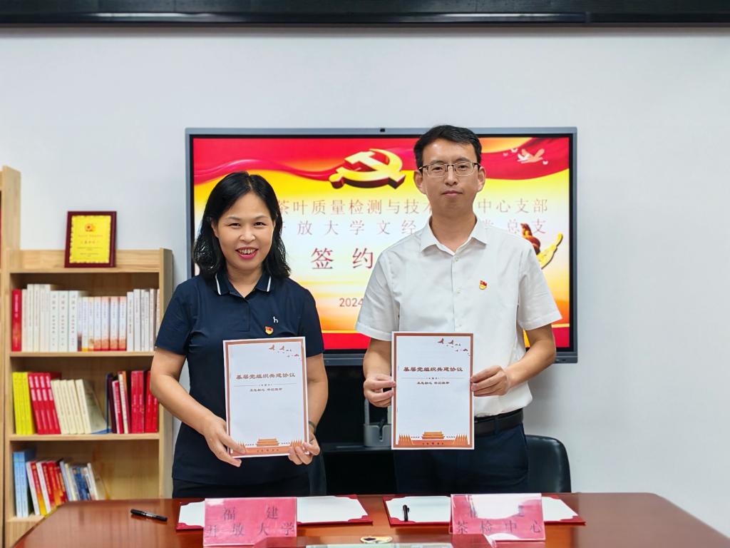 校检共建 在茶检中心党员活动室,文经学院党总支班子与省茶检中心党支部开展了校检共建座谈会。党总支书记王妙真与省茶检中心党支部书记兰元签署了基层党组织合作共建协议。双方表示,将深入贯彻落实习近平总书记关于统筹发展茶文化、茶产业、茶科技的重要指示精神,发挥检校党建联动优势,创新基层党组织共建联创机制,为助力我省乡村振兴培养更多应用型人才。
