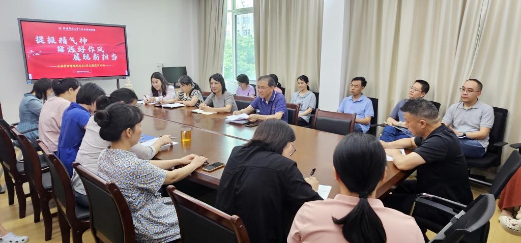 为推动教职工作风建设常态化、长效化,进一步深化“一院一品”廉洁文化品牌建设,5月20日下午,公共管理学院结合“开放育廉,清风润心”廉洁教育主题活动月安排,以“提振精气神、锤炼好作风、展现新担当”为主题开展主题党日活动。本次活动由党总支书记黄庆安主持,全院教职工参加。