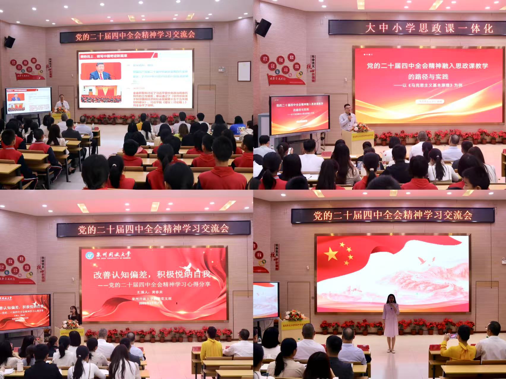 在附属中学鳝溪校区,三个党支部联合开展党的二十届四中全会精神专题学习交流会。马克思主义学院学术带头人范五三副教授以《在接续奋斗中谱写中国式现代化新篇章》为题,深入解读党的二十届四中全会精神的核心要点。马克思主义学院党支部韩微老师和泉州开放大学教学党支部黄春美老师立足自身工作实际,分别以《党的二十届四中全会精神融入思政课教学的路径与实践》和《改善认知偏差 积极悦纳自我》为题,分享学习党的二十届四中全会精神的心得体会;附属中学鳝溪校区黄艳虹老师深情朗诵经典篇目《读中国》,字里行间充满了对祖国繁荣昌盛的自豪之情。活动举行赠书仪式,马克思主义学院党支部将《习近平谈治国理政》第五卷赠予附属中学鳝溪校区党支部,以促进支部间的理论共学和思想交流。