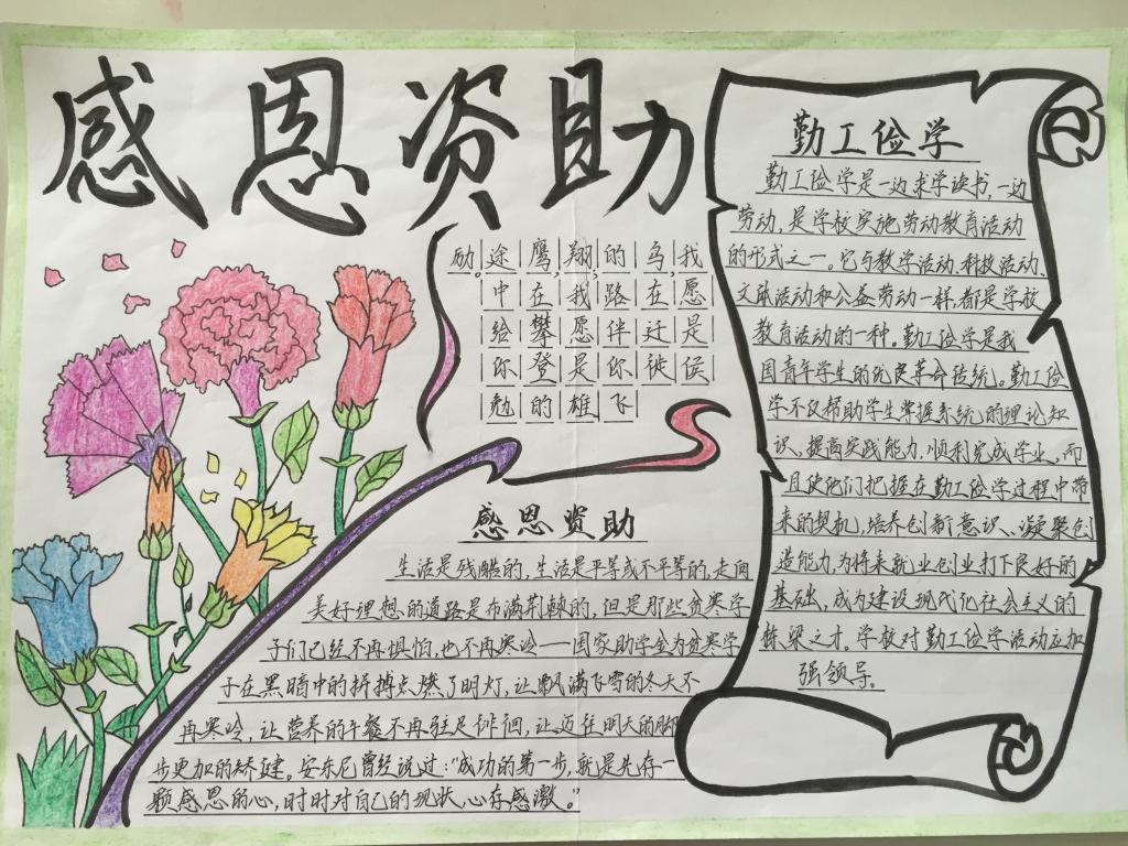 为了促进感恩教育,积极宣传国家资助政策,倡导受助感恩、励志成才、回报社会的良好风气,进一步发挥资助育人作用,职业学院团委、职业学院学生资助管理中心联合面向全体中职学生举办了“勤工俭学,教育扶贫”手抄报征集活动。
