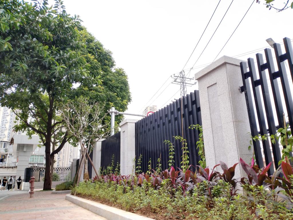 原有围墙为砖混结构,承重较大、年久失修,存在安全隐患。新建围墙栏杆为黑色竖向方钢;柱面采用荔枝面花岗岩,中间镶刻横向条纹,顶部为方块石压顶;人行道种植桂花树、炮仗花等。整体看起来内外通透,庄重、简洁、大气又不失现代美感,与新建大门完美结合,相得益彰。