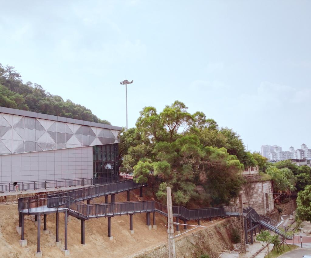 新建栈道采用钢结构,在建造过程中克服高边坡施工难度,尽量减少对原有树木和毛石挡墙的破坏,通过两个转弯设计,巧妙的将栈道、树木、边坡结合在一起,与新改造的体育馆相互映衬。在山脚下看,就像缩小版的“福道”,美不胜收。