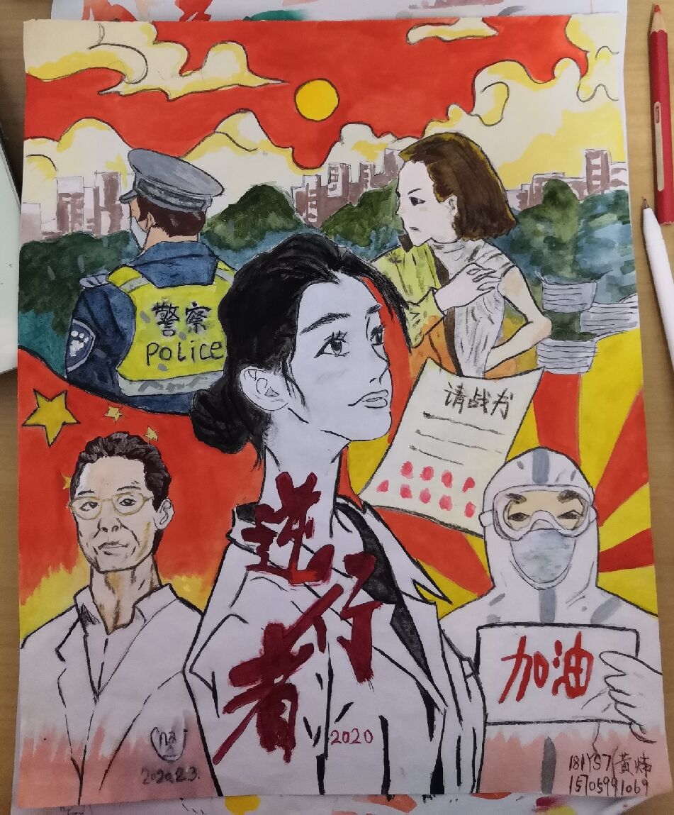 本次参赛作品包括书法、绘画、电子海报三大项。活动受到了同学们的热切关注,截止5月5日下午17:00,共收集参赛作品40件。同学们满怀激情,用心勾画每一缕线条,认真写下每一个汉字。宣传画中的援鄂医者形象体现了同学们“抗击疫情,为中国加油”的满腔热情,书法作品中的一撇一捺都体现着中国学生在党的培养下茁壮成长的良好精神面貌。