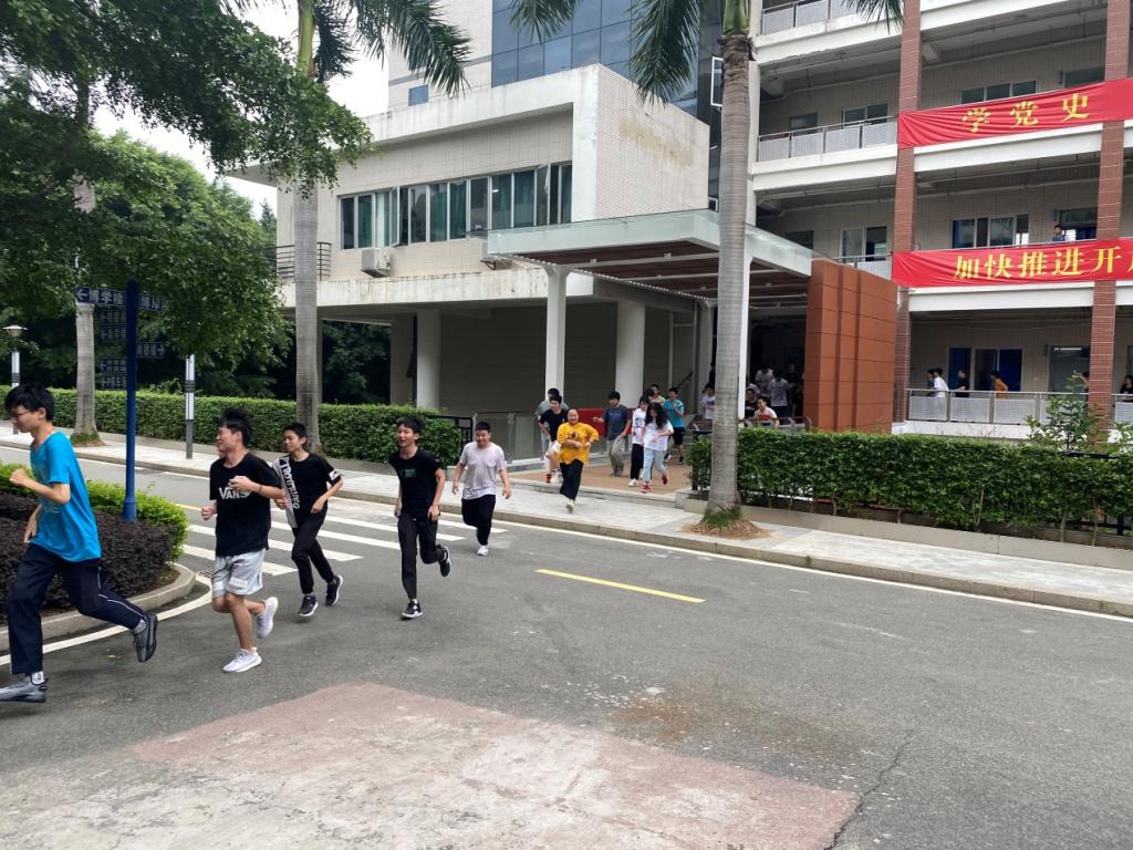 演练模拟教学楼区域发生强烈地震,保卫科通过校园广播通知所有师生就近紧急避险。师生在听到广播后,采取就近蹲于桌下或承重墙角、用书或书包保护头部、蜷曲身体等方式紧急避险。广播发布疏散信号后,班主任迅速组织学生按照疏散路线离开教室到广场集合,并清点人数。