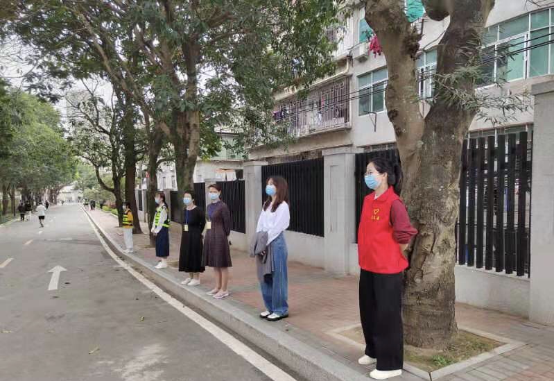 除人群最为集中的食堂外,校园内的其他地方也随处可见防控志愿者们的身影。学校大门口站岗的志愿者们配合安保人员,对入校人员进行身份核验、二码(健康码和行程码)核查和体温检测,严格做到逢人必检、逢车必查;学生服务中心值班的志愿者们严格对进入人员进行登记,并要求佩戴好口罩方可入内;校园小卖部的志愿者劝导同学们佩戴口罩入内购物,等候结算期间排队间隔1米;校园巡逻志愿者们在午间与下午下课后跟随老师巡查各地,提醒同学们带好口罩,少点外卖,拿取快递要消杀。