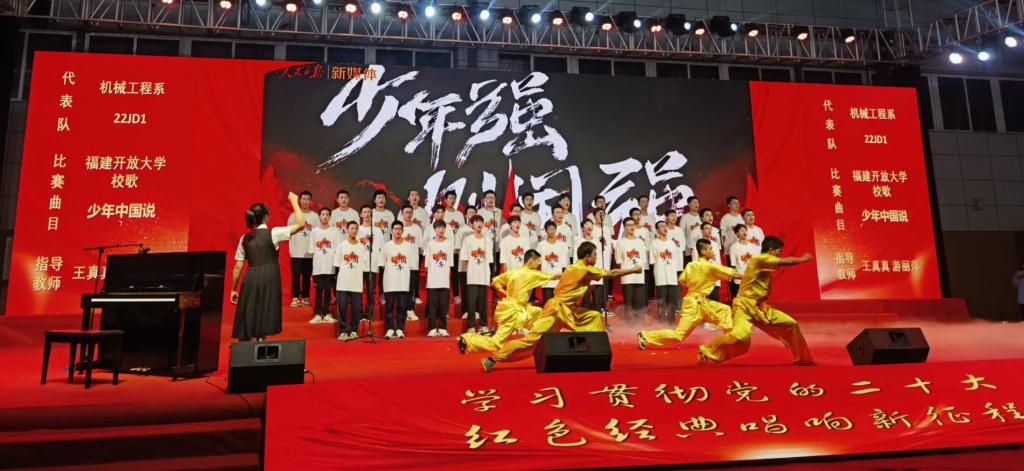 本次比赛经过前期各系部推荐,共有八只队伍入围现场决赛,同时更有教职工合唱表演与学生话剧演出等节目参与其中,活动现场精彩纷呈。比赛中,各班合唱团身着整齐的服装,以饱满的精气神,用高亢嘹亮的歌声,展现青春风采。同学们不仅以悠扬的歌声唱响《福建开放大学校歌》,同时也激昂的演唱着《团结就是力量》《没有共产党就没有新中国》《少年中国说》等红色曲目。合唱中还穿插了中国武术、朗诵、舞蹈、等多种艺术表现形式,同学们身着各类传统服饰,大气潇洒的招式、飘逸灵动的舞姿和慷慨激昂的朗诵,无不诠释着中华文化的精髓和内涵,刚中带柔,柔中带刚,让传统体育、民族文化与现代艺术融会贯通,展现了学院青年自强不息的精神和中国文化的博大精深。最终2022JD1班赢得一众评委青睐,获得此次合唱比赛一等奖。