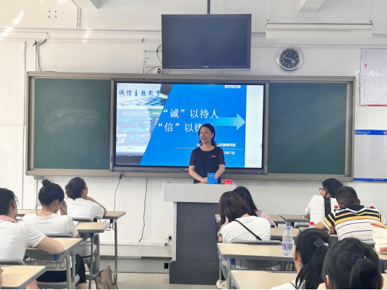7月9日,学院党总支副书记、副院长李瑞中,为学生开展《“诚”以待人 “信”以律己》为题的形势与政策课。“国无信不兴,人无信不立”,李瑞中列举了生活中的现实事例,引用相关视频,引导同学们在视听画面中理解诚信内涵,感悟诚信之理。她结合2023春季期末考试为同学们解读学校关于考试违纪、作弊认定和纪律处分条例等文件要求,多角度、多层面强调诚信考试的重要性,自觉抵制违纪作弊行为。她勉励同学们要具有正确的价值观、人生观和高尚的道德水准,进一步增强诚信意识,自觉培养诚信品格,做到以信立人,以信处事,成为有益于经济社会高质量发展的优秀建设人才,为构建人人讲文明、处处见诚信的开放大学校园文化添光增色。