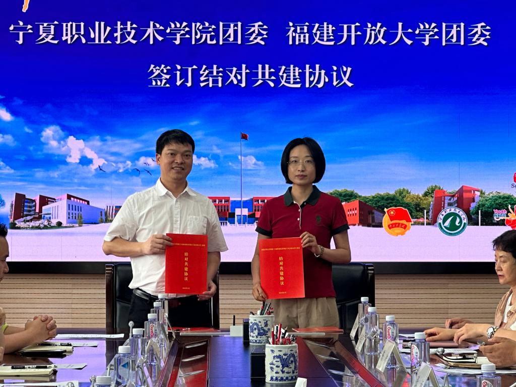 青春心向党、共叙闽宁情。5月28日上午,闽宁实践小分队一行赴宁夏开放大学学习交流,受到宁夏开放大学校党委副书记张桓、副校长陈灿亲切接见。随后,实践小分队一行与宁夏开放大学师生代表参加了主题为“青春心向党、共叙闽宁情”闽宁两地开放大学共青团交流座谈会,宁夏开放大学团委书记张淼主持会议。校党委副书记张桓出席座谈会并讲话。他说,闽宁协作是习近平总书记亲自开创、亲自指导、亲自部署、亲自推动的伟大事业。当前闽宁协作取得了实实在在的成效,实现了“两个百万”目标。他希望两校在闽宁合作的框架下,在两校深化闽宁合作的大平台上,探索合作新模式、新路径,携手共进、共谋发展,特别是两校的共青团工作共学共进共促,切实推进宁夏开放大学与福建开放大学合作协议落地落实。会上,黄生春和张淼代表两校签订了共青团共建结对协议。
