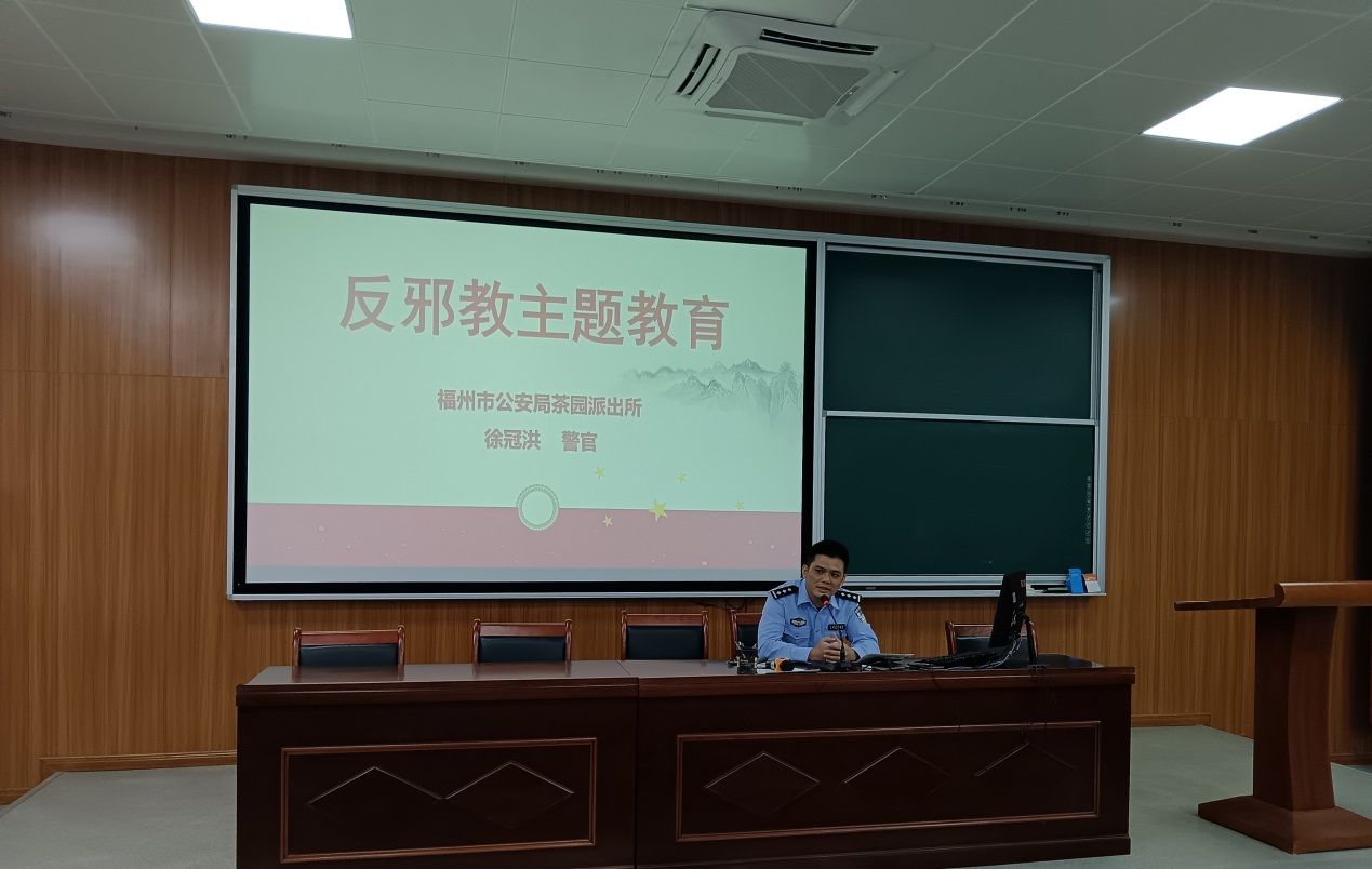 10月24日下午,为深入推进校园反邪教宣传教育工作,提高师生识别和防范邪教意识,增强抵制邪教侵蚀的能力,营造安全稳定的校园环境,职业学院特邀福州市公安局茶园派出所徐冠洪警官到职业学院,开展反邪教警示教育主题讲座。