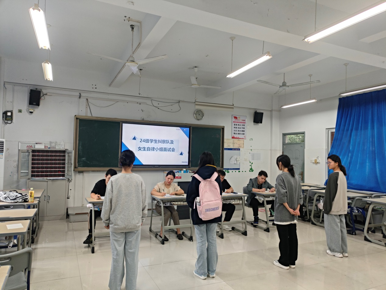 为进一步推动创建和谐平安校园,加强学生文明纠察队和自律小组队伍建设,10月24下午,职业学院开展2024级学生纠察队、女生自律小组选拔,学院多位生活老师担任面试官。