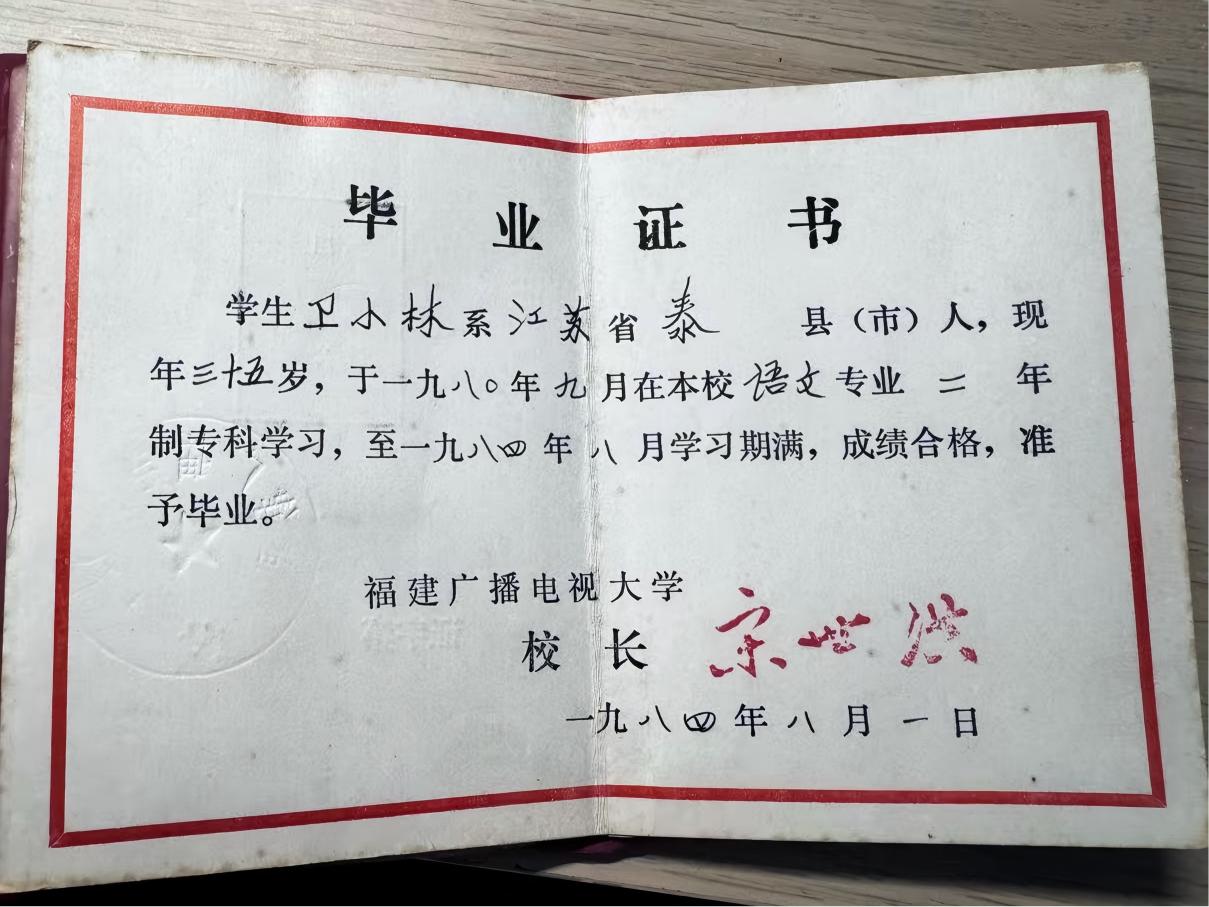 1984年卫小林从福建广播电视大学毕业时,曾写下感言“斯室虽陋,吾以为傲”,感恩母校虽条件朴素却始终向所有人敞开求学之门。她说,“如今,当我再次以学生的身份踏入开放大学,这里已经成为更广阔的云端大学城,我为能够成为终身学习浪潮中继续前行的一员而自豪。”