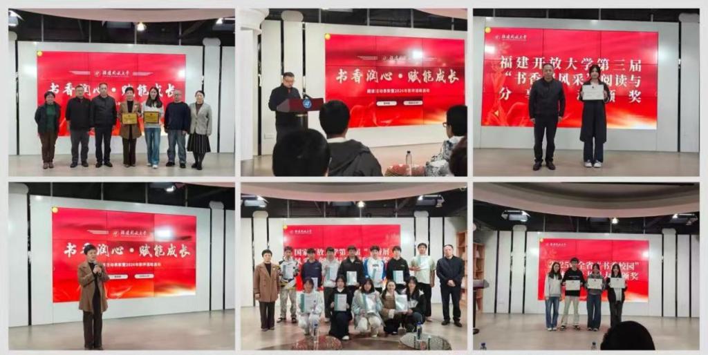 我校学子凭借深刻的阅读感悟与扎实的文字功底在2025年全省“书香校园”立体阅读书评大赛、国家开放大学第三届“书香展风采”阅读与分享活动、我校“书香展风采”阅读与分享活动中斩获多个奖项,陈明阳、汪媚等分别为获奖者颁奖。其中,我校职业学院在阅读活动组织过程中贡献突出,荣获“优秀组织奖”。