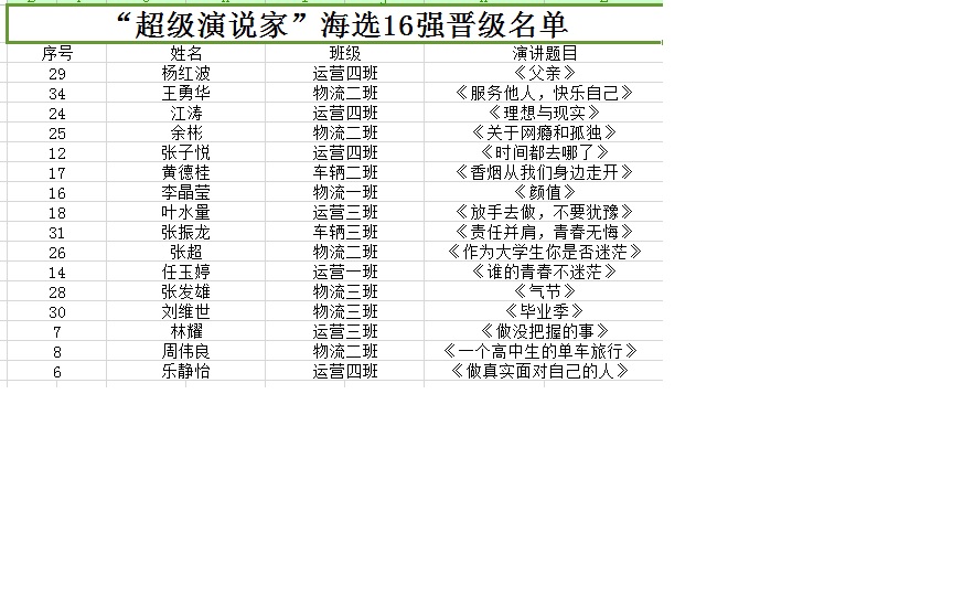 本次海选有来自学院高职、成人大专、中职共36名的学生参加了比赛,参赛选手们以独特的视角和良好的舞台表现力赢得了现场观众的热烈掌声,展现了当代大学生良好的精神风貌以及第一季“超级演说家”大赛敢说敢自我的精神理念。其中,高职运营4班杨红波同学演讲的《父亲》更是感人至深,赢得全场喝彩。经过评委老师激烈讨论和层层筛选,最后推选16名优秀选手脱颖而出晋级复赛。