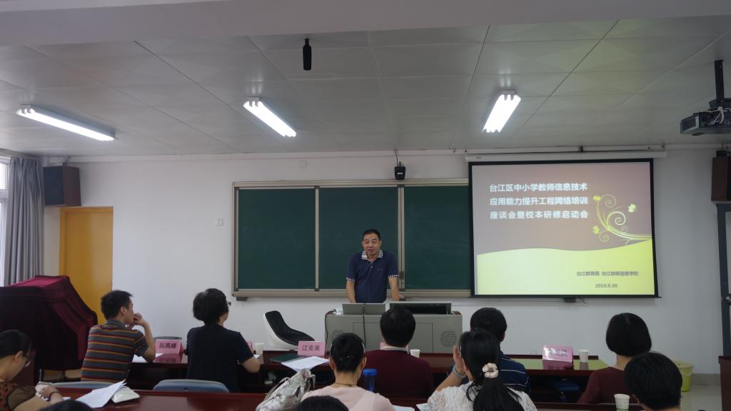 9月30日上午,台江区中小学教师信息技术应用能力提升工程网络培训座谈会暨校本研修启动会在台江区教师进修学校召开。福建广播电视大学培训学院副院长江克英、台江区教育局副局长、区工程办负责人吴予、教育局人事科长赵佳、台江区教师进修学校校长李燕斌、区督学郭芝灵、浙江师范大学网络继续教育学院院长助理阮高峰以及台江区各学校分管校本研修的主任、教研员及学科工作坊优秀代表共计70人参加了会议。会议由教师进修学校培训处林冰老师主持。