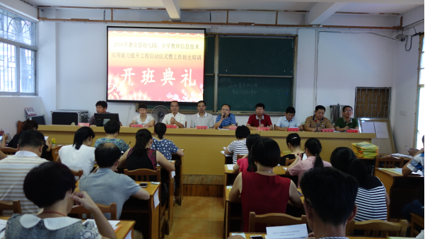 7月6日上午,2016年惠安县幼儿园、小学教师信息技术应用能力提升工程启动仪式暨工作坊主培训在惠安县教师进修学校举行。培训学院院长林永周、副院长江克英、惠安县教育局局长陈建辉、副局长李培玉,惠安县教师进修学校校长杜邵玉、副校长黄永坚及惠安县校(园)长、教研员和骨干教师(坊主)共103人出席了开班式。开班式由黄永坚主持。