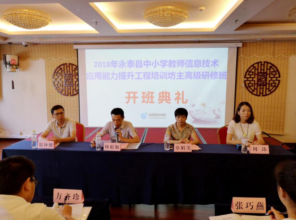 8月7日上午,2018年永泰县中小学教师信息技术应用能力提升工程培训坊主高级研修班在青岛举行开班仪式。培训学院副院长杨聪颖、永泰县教师进修学校书记卓娟美、副校长郑钟健、海西教育网远程培训部主任周玮及永泰县幼儿园、中小学坊主共计32人出席开班式,仪式由周玮主持。
