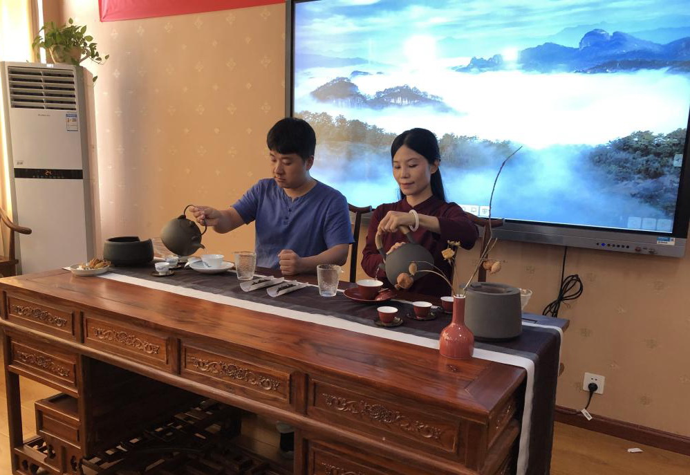 实训开展前,由副院长王妙真及相关专业教师蔡颖华、齐学东、周霞组成的指导小组从作品主体内容及总体设计、背景PPT的制作、背景音乐的选择、解说词的准备及与冲泡流程的契合度等方面进行指导。参加实训的5个小组学生分别展示了《茶之道·乌龙茶》、《洗尽铅华·铁观音》、《岁月之味·品读武夷老枞水仙》、《闽式乌龙十八道茶艺》、《初心·白茶》等不同茶类的茶艺。实训现场品茗鉴茶、茎香盈室、音乐流淌,学员们尽情展示娴熟的冲泡技艺,让在场的师生感受了一场融视觉、听觉、嗅觉、味觉于一体的茶艺盛宴,从中国优秀传统茶文化感受思想洗礼。