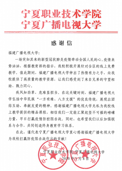 5月8日,宁夏广播电视大学向我校发来感谢信,感谢我校提供优质的继续教育网络课程资源,支援其防控疫情期间开展“停课不停学”线上教学活动,并高度赞赏了我校团结互助、奉献友爱的精神,希望今后能够继续加强合作,共同促进终身教育事业的发展。