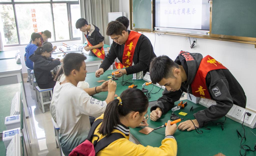 电气工程系展示了电子专业的办学特点,并从实训安排、教育教学成果、学生技能大赛、学生升学等方面介绍电子专业的建设成效及亮点。同时,安排学生参观技能大赛及实训期间电子专业学生的作品,通过极具专业特色的可编程旋转灯、声控灯、简易充电宝、圣诞树、心型流水灯等作品展现专业魅力;安排电烙铁焊接操作体验,让学生感受动手的快乐和电子专业的魅力。