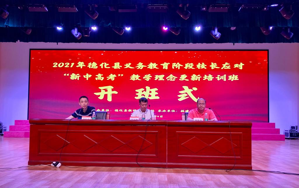 为全面落实新中高考改革政策,提高校长专业素养,培养一支高素质、理念新的中小学校长队伍,为义务教育教学改革和发展提供优质人才。5月14日上午,由福建开放大学和德化县教师进修学校联合举办的2021年德化县义务教育阶段校长应对“新中高考”教学理念更新培训班在德化县德化职业技术学校凤凰山讲堂拉开帷幕。福建开放大学培训学院副院长杨聪颖、德化县教育局局长黄文和、德化县教师进修学校校长余德兴以及德化县中小学学校校长、部分教师代表,共计350人出席了开班仪式。本次仪式由德化县教师进修学校校长余德兴主持。