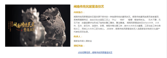 福建开放大学官网和福建终身学习在线开设非物质文化遗产展播专栏,设置了守艺传承、闽风闽俗、一代宗师、清歌雅舞、闽风曲韵、妙手丹青、珍馐美馔、茶香氤氲、匠心雕刻等十个类目,分批次上线展播制作完成的非物质文化遗产优秀网络课程,城乡居民可登录平台观看学习。后期,将通过“福建终身教育”微信公众号等新媒体手段,定期推出视频课程,提升城乡居民的非遗保护和传承意识。
