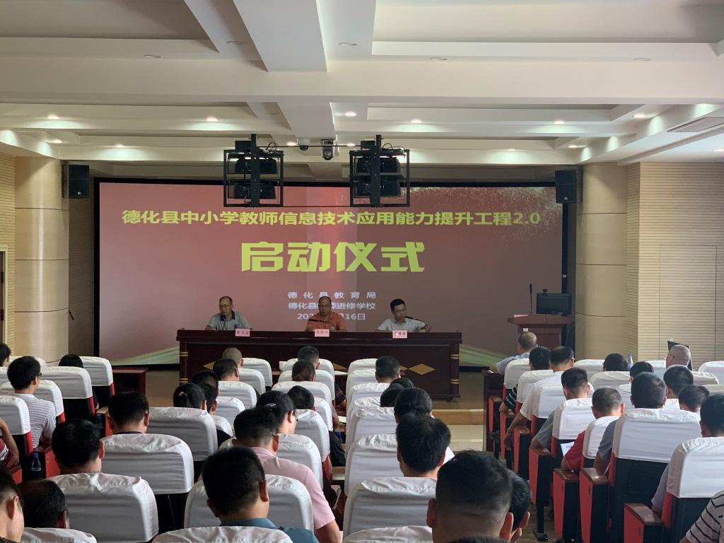 德化县教师进修学校校长余德兴、县教育局组织人事股股长陈文滔、县人民政府副校级督学罗德榜及县教育局相关股室负责人出席活动,培训学院相关人员,德化县各中学、中心小学、县直学校校(园)长和2.0工程项目负责人等合计70人参加。此次启动大会由罗德榜主持。陈文滔对《德化县中小学教师信息技术应用力提升工程2.0实施方案》进行了全面解读。