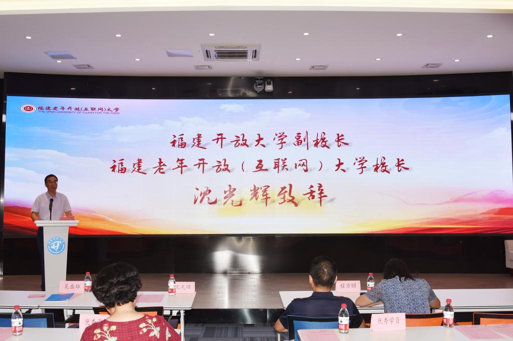吴盛雄宣读福建老年开放(互联网)大学2021届优秀毕业生学员名单,沈光辉为获奖者颁发荣誉证书。