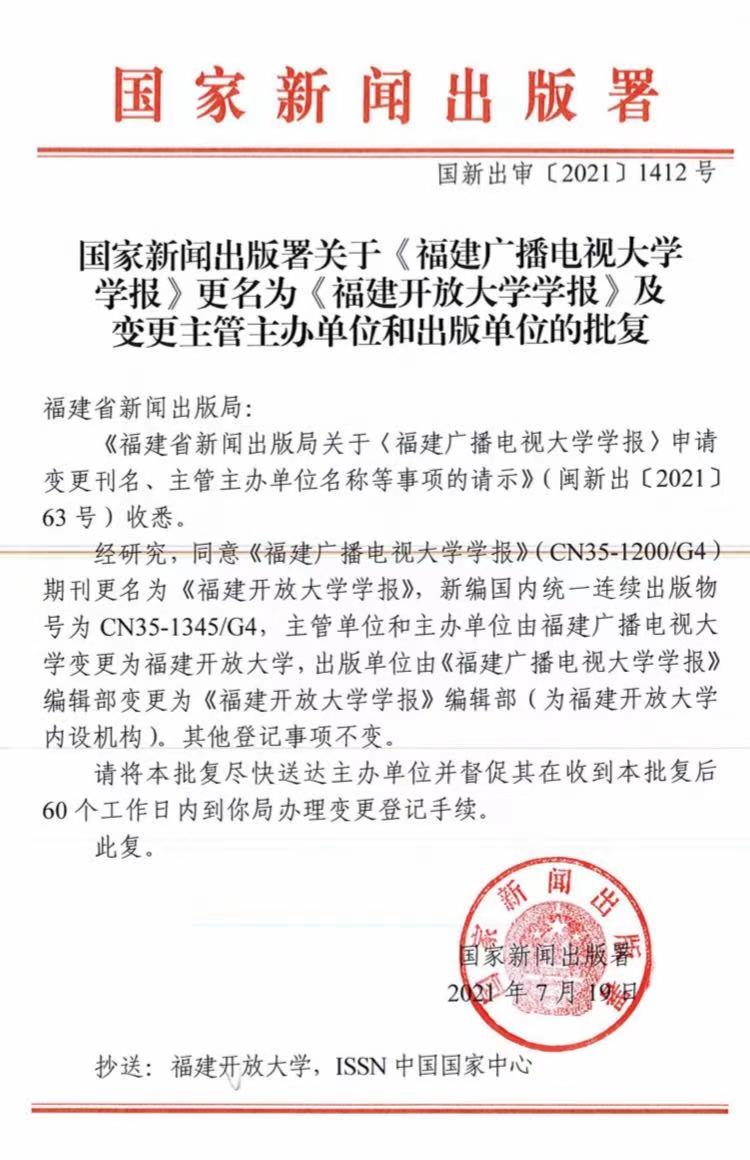 日前,从国家新闻出版署传来喜讯,我校原学术刊物《福建广播电视大学学报》正式更名为《福建开放大学学报》,新编国内统一连续出版物号为CN 35-1345/G4,主管单位和主办单位由福建广播电视大学变更为福建开放大学,出版单位由《福建广播电视大学学报》编辑部变更为《福建开放大学学报》编辑部(为福建开放大学内设机构)。解决了学报在国家新闻出版署以《福建电大学报》刊名登记和以《福建广播电视大学学报》出刊的不相符合的历史遗留问题。自从福建广播电视大学成功更名为福建开放大学后,编辑部立即着手刊名变更事宜,暑假期间也不间断,向福建省出版局办理变更登记手续后,又向ISSN中国国家中心提出ISSN申请,新编国际标准连续出版物号为ISSN 2097-0412。