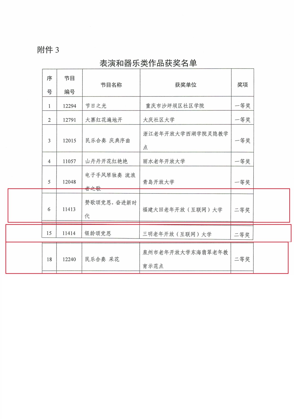 日前,国家开放大学公布首届全国老年教育教学成果展(第二批)评奖结果。福建老年开放(互联网)大学体系共10个节目获奖,其中声乐类1个,太极类2个,表演和器乐类7个(含戏曲类4个)。至此,本届成果展6类作品获奖名单及优秀组织单位获奖名单都已公布。福建地区本届获奖作品16个,优秀组织单位4个。