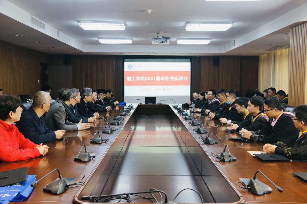 12月12日上午,在全省电大系统举办的毕业典礼暨学位授予仪式后,理工学院在桂山校区明德楼1405会议室召开毕业生代表座谈会,学院领导、系主任、教师代表、班主任和2021届毕业生代表共50余人参加了座谈会。会议由副院长黄林昊主持。