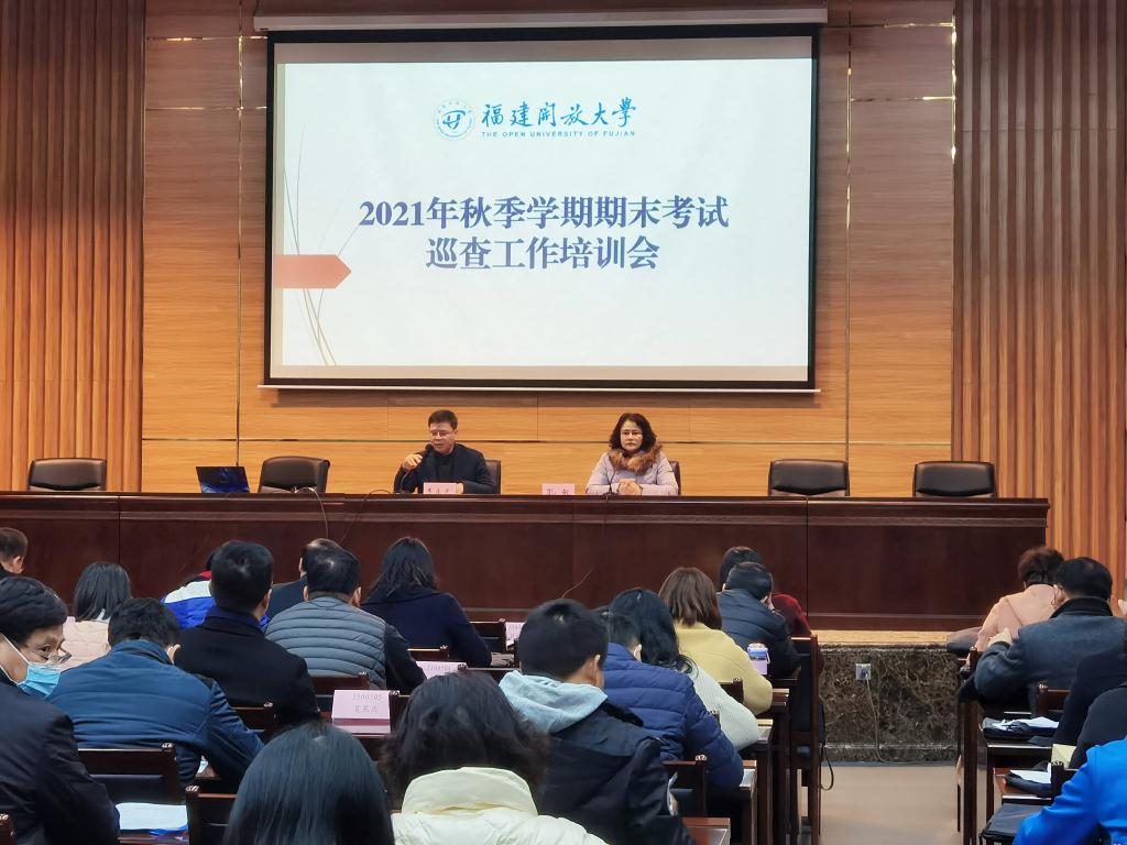 2022年1月6日下午,福建开放大学召开2021年秋季期末考试巡查工作培训会,副校长李正光出席并讲话。会议由教务处副处长孔敏主持并做巡考工作培训。
