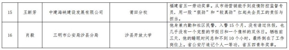 近日,国家开放大学印发《关于公布国家开放大学杰出校友、优秀校友名单的通知》,我校推荐的20位校友悉数被授予国家开放大学杰出校友、优秀校友称号。其中,国家开放大学授予黄志丽、郑月娥、钟兆云、郭正光等15位校友“国家开放大学杰出校友”称号,追授肖毅“国家开放大学杰出校友”称号,授予钟德彪、陈进富等4位校友“国家开放大学优秀校友”称号。
