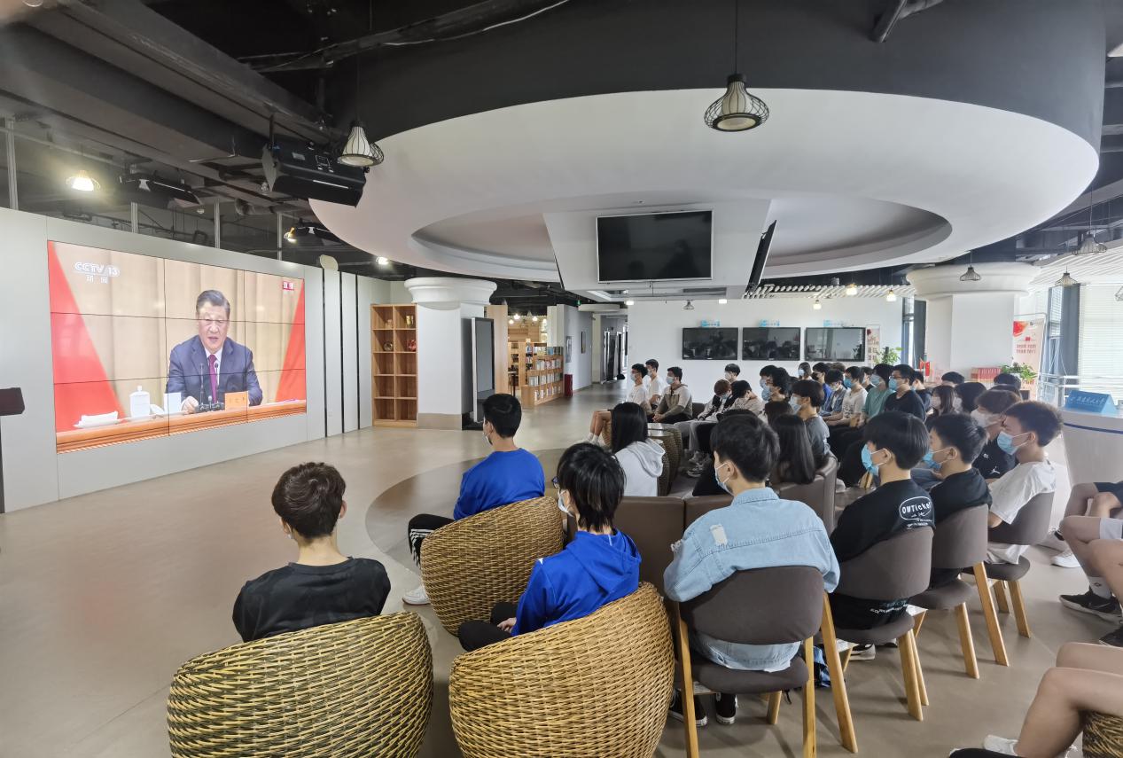大会中,习近平总书记代表党中央,向全体共青团员和各级共青团组织、团干部致以热烈祝贺及诚挚问候。“青春孕育无限希望,青年创造美好明天。一个民族只有寄望青春、永葆青春,才能兴旺发达。”习近平总书记通过回顾共青团建团100周年历程,总结建团百年以来的伟大成就,强调“共青团要增强引领力、组织力、服务力,团结带领广大团员青年成长为有理想、敢担当、能吃苦、肯奋斗的新时代好青年,用青春的能动力和创造力激荡起民族复兴的澎湃春潮,用青春的智慧和汗水打拼出一个更加美好的中国!”在收看直播的过程中,青年师生们都全神贯注,聚精会神,认真学习,用心领悟,大家纷纷表示,作为时代青年的一份子要听党话、跟党走,以实际行动迎接党的二十大胜利召开。