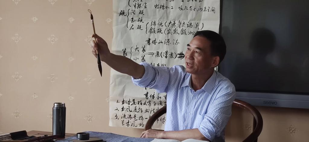 刘玉兴首先介绍学习书法的基本要求和基本规律,指出学好唐楷对打牢书法基础的重大意义,并强调要“立足于一体”,要从“高处着眼”。紧接着他讲解“文房四宝”、书体的演变、历代书家风格及其流派特点。他着重讲授了楷书的入门要领,从书写姿势、执笔方法、运腕方法和运笔技巧等方面进行形象直观地教学,同时辅之以 “永”字八法示意图深入讲解。最后,同学们跃跃欲试,纷纷提笔练习,刘玉兴老师对学生的习字逐一点评和指导。