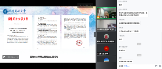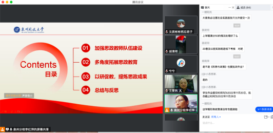 集体备课会上,学院思政课责任教师就本学期课程教学安排分别做了说明。韩微老师细化讲解了本学期社会实践(学习行为表现)考核办法,包括社会实践主题、作答窗口开放与关闭时间,以及作业批改规范性问题。戴梦思老师围绕《形势与政策》课程进行“怎么学、怎么考”专题解读,并突出强调该门课程本学期教学安排的变化及应付策略。林小慧老师对上学期的教学团队运行及直播联讲情况进行了分析总结。泉州开放大学李红萍老师从加强思政教师队伍建设、多角度拓展思政教育、以研促教提炼思政成果等方面做了学生思政课实践教学方面的经验分享。