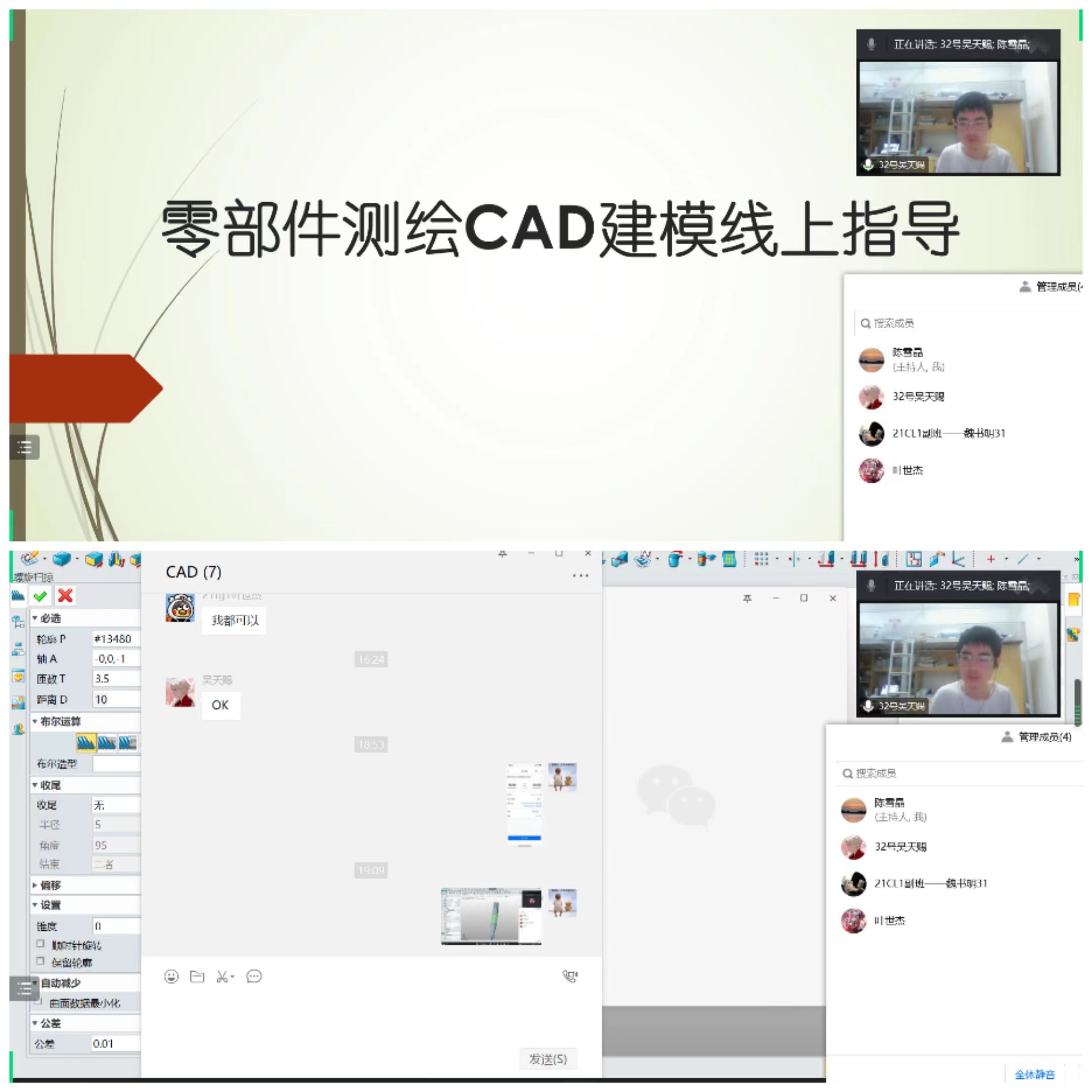 疫情防控期间,线下教学停下了脚步,为更好的指导系部零部件测绘与CAD成图技术兴趣小组的同学们参赛备赛,做到停课不停学,停课不停练,兴趣小组的日常训练转移到了线上,指导老师和学生们相聚“云”端,常规的技能训练不曾停下脚步。陈雪晶、王招两位专业教师充分利用网络教学平台,指导兴趣小组的同学们开展一轮又一轮的日常训练,备战2023年省属职业院校技能大赛“零部件测绘与CAD成图技术”项目,师生兴致勃勃,斗志高昂。