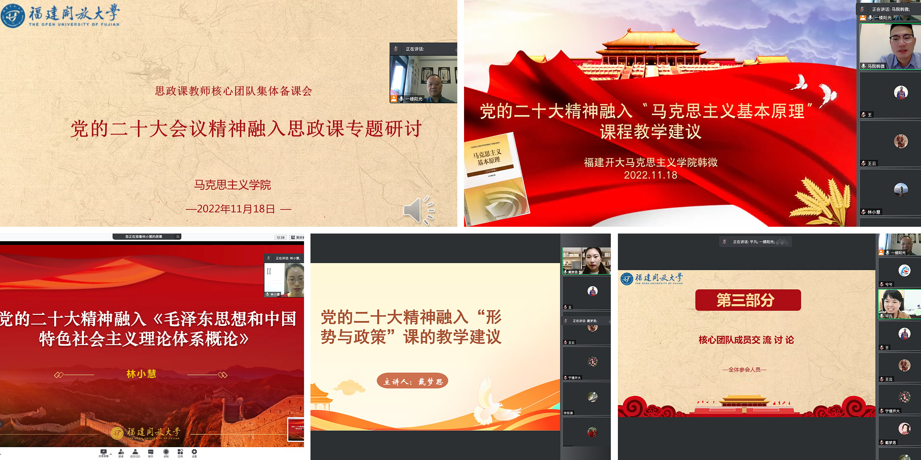 备课会上,专任思政课教师林小慧、韩微、戴梦思分别围绕《毛泽东思想和中国特色社会主义理论体系概论》《马克思主义基本原理》《形势与政策》三门课程,以逐章讲解、图表对比、教学重难点针对性突破的方式,结合每门课程的不同特征,就党的二十大精神“融什么”和“怎么融”进行教学设计展示。思政课学科带头人、外聘教师范五三博士对三位老师的教学设计进行点评。他表示,党的二十大精神融入思政课程是当下和今后一个时期思政课程教学的重要环节,融入教学需要明确四个逻辑,一是深研课程理论逻辑,激发学生理论需求;二是紧扣学生认知逻辑,结合开大学生具体特点开展教学实践;三是注重知识历史逻辑,突出时代特征与世界视野;四是建构良好叙事逻辑,通过时空叙事、情感叙事、哲学叙事等方式引领学生理解习近平新时代中国特色社会主义思想的深刻内涵。