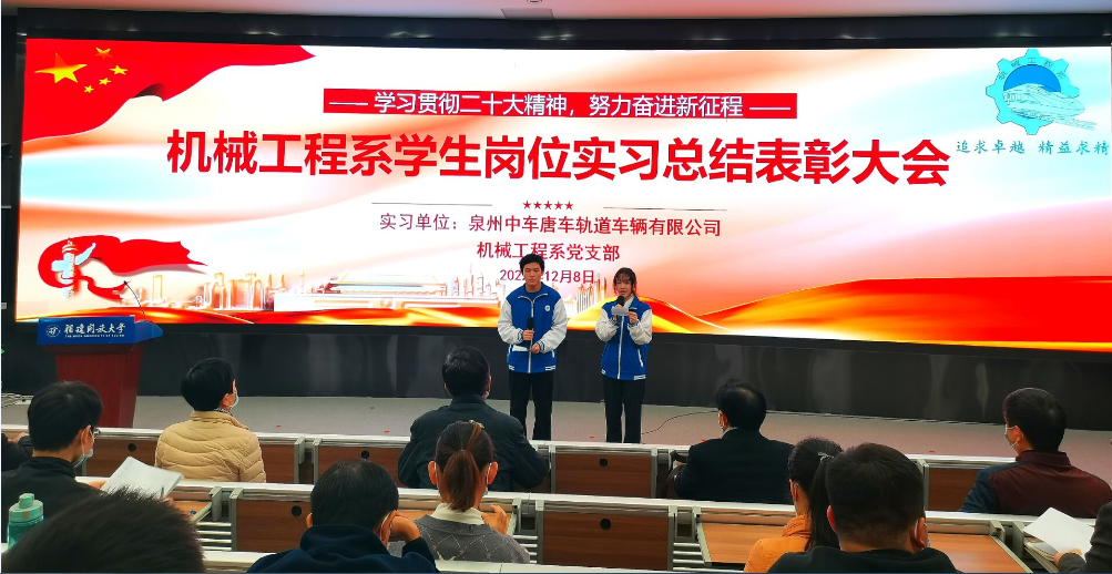 习近平总书记指出,在全面建设社会主义现代化国家新征程中,职业教育前途广阔、大有可为。在职业学院党总支的领导部署下,机械工程系党支部组织系部2020级学生共61人分两批到泉州中车唐车轨道车辆有限公司参与为期6个月的实习,以此为依托创建党建工作品牌,实现党建工作与教育教学、校企合作、家校联系、学生实习就业深度融合,点燃系部事业发展的新引擎。12月1日,第一批岗位实习学生结束实习任务安全有序返校。